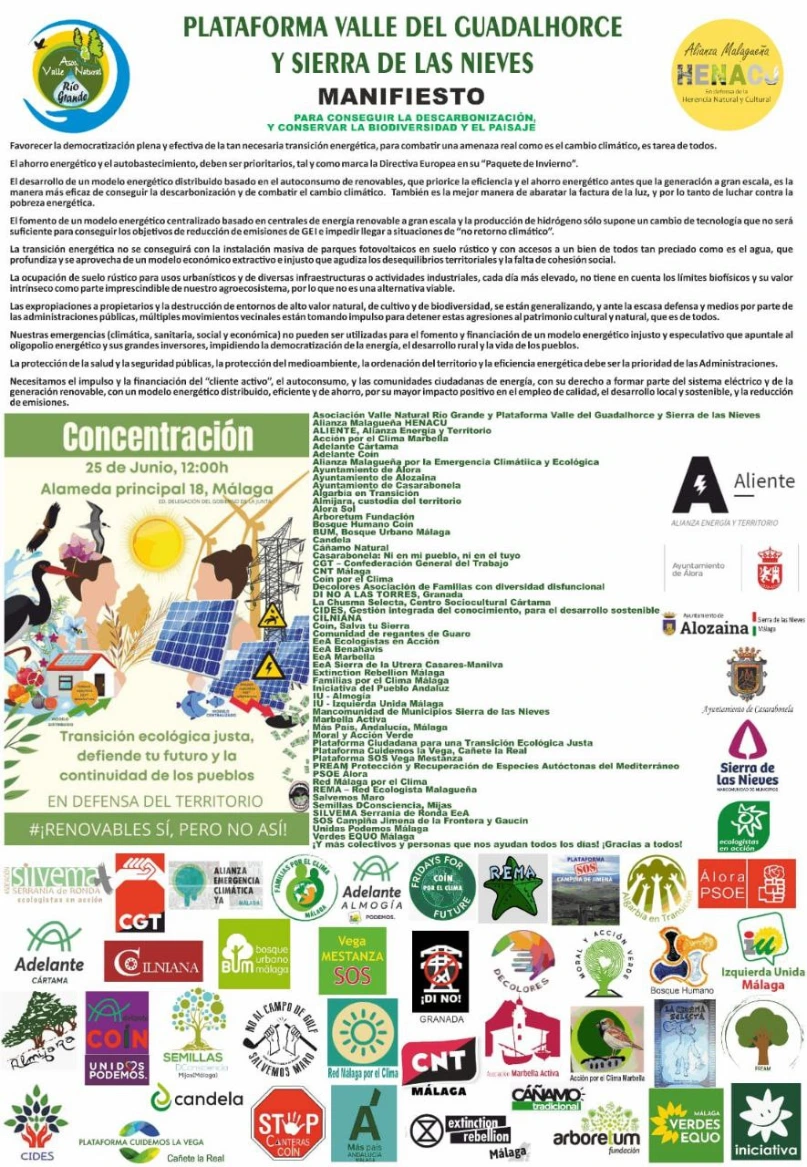 La pasada mañana del 25 de junio, a las doce de la mañana, en la Alameda Principal de Málaga, nos hemos sumado a la concentración "#¡Renovables sí, pero no así", junto a muchas otras organizaciones, convocadas por la Plataforma "Valle del Guadalhorce" y donde se ha leído el siguiente MANIFIESTO PARA CONSEGUIR LA DESCARBONIZACIÓN Y CONSERVAR LA BIODIVERSIDAD Y EL PAISAJE: